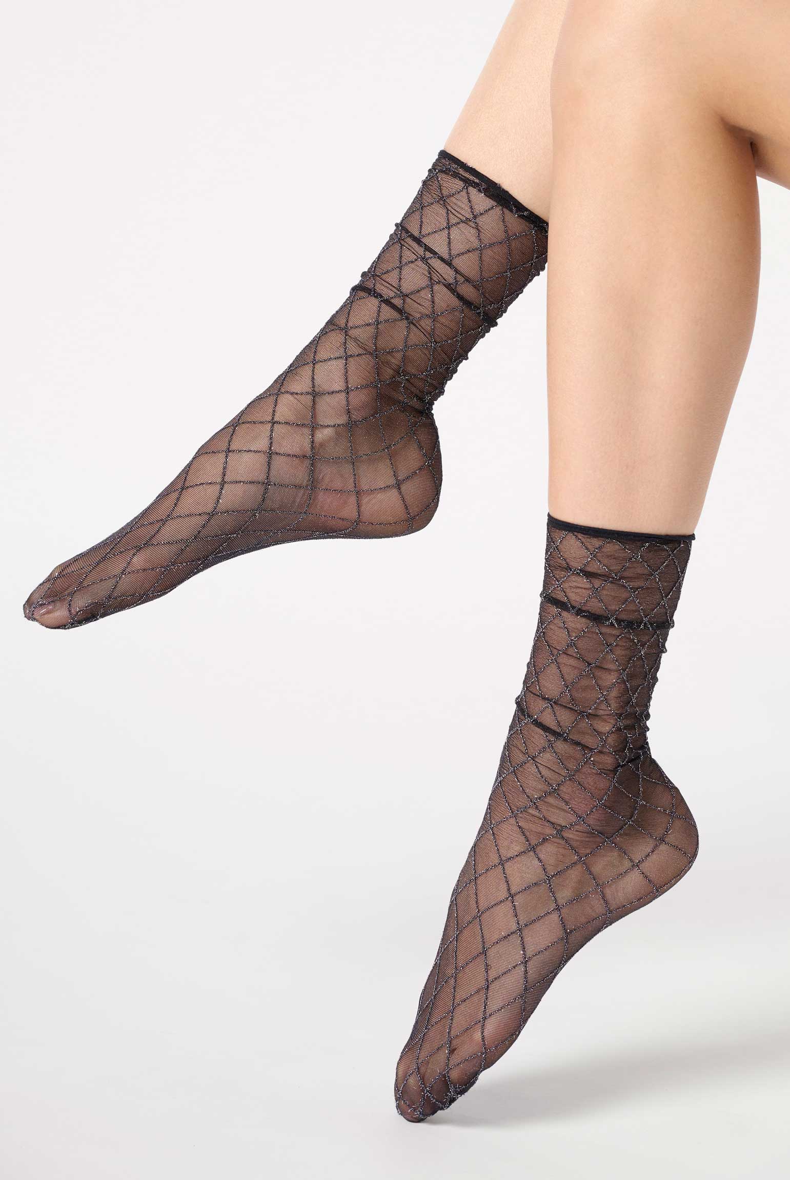 Available in a geometric mesh pattern with a subtle silver thread effect, these sheer ankle socks add texture and visual interest without overpowering an outfit. The silver thread detail enhances the geometric pattern with a gentle shimmer, making these socks perfect for pairing with loafers, heels or ankle boots.