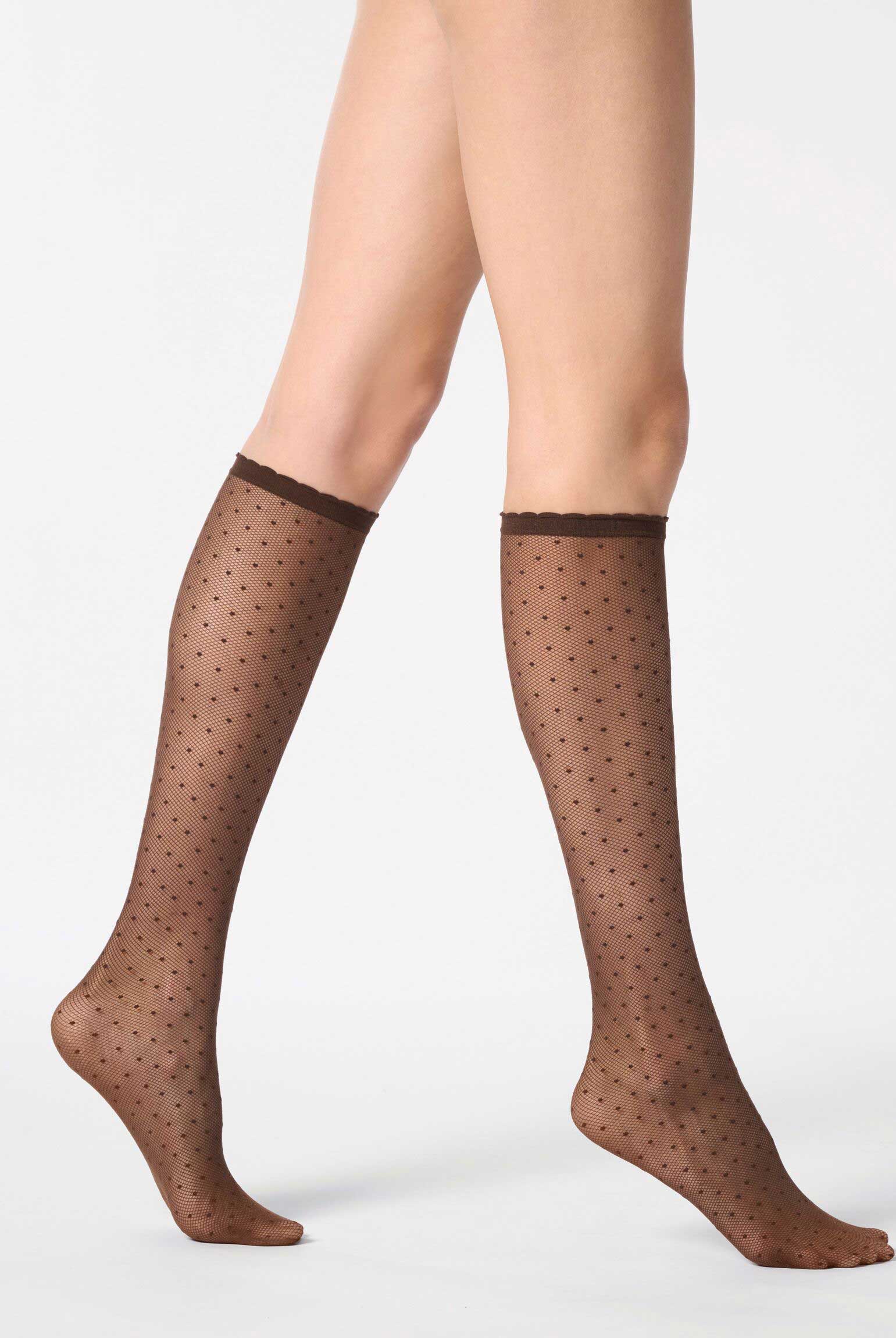 Add a refined touch to your outfit with these elegant Oroblu sheer knee-high socks. Crafted with a delicate tulle effect, they feature a subtle micro polka dot pattern that enhances their feminine and sophisticated appeal. The softly capped cuff ensures a comfortable fit while maintaining a polished finish. Lightweight and breathable, these knee highs are ideal for all-day wear and effortlessly complement both casual looks and more dressed-up ensembles. Available in classic moka and black, they are a timeless hosiery essential for any wardrobe. Composition: 95% Polyamide & 5% Elastane